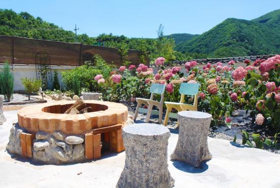 독채 한옥펜션으로 넓은 마당과 야외 자쿠지, 꽃내음 가득한 정원과 하늘공원 등