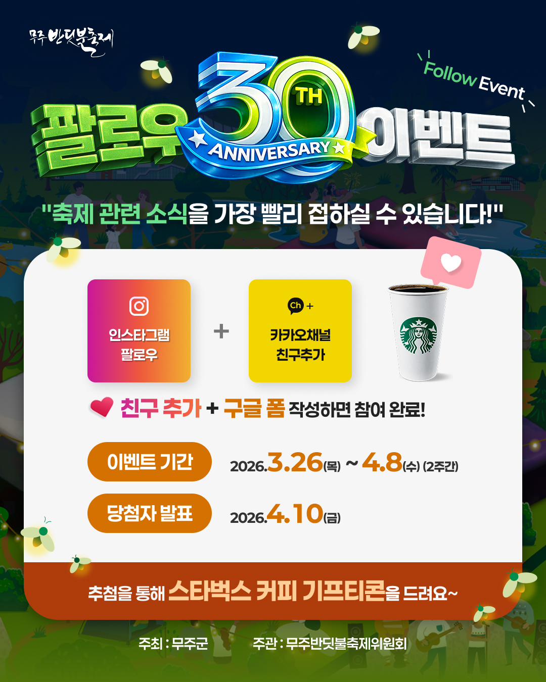 카카오채널과 함께 인스타그램까지 팔로우하시면, 추첨을 통해 30분께 '스타벅스 아메리카노'를 드립니다! 공식 인스타그램에는 앞으로 알찬 정보와 방문 꿀팁들이 가득 올라갈 예정이니 절대 놓치지 마세요! 단 5분이면 참여 완료! ① 카카오 채널 친구추가 화면 '캡처' ② 인스타그램 팔로우 화면 '캡처' ③ '구글폼' 제출하면 참여완료! 이벤트 기간: 2026. 03. 26(목) ~ 2026. 04. 8(수) 당첨자 발표: 2026. 04. 10(금) 인스타그램 링크 : https://www.instagram.com/mujufireflyfest/ 카카오채널 링크 : http://pf.kakao.com/_CmVxgb 구글폼 링크 : https://forms.gle/YE3yeDcGGSCGUALW7 |